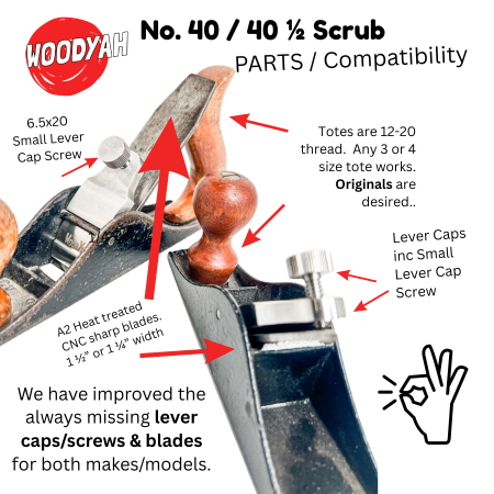 Get your scrub plane back to work with the parts that matter — 40 blades (1-1/4"), 40½ blades (1-1/2"), 40 lever caps, and 40½ lever caps.