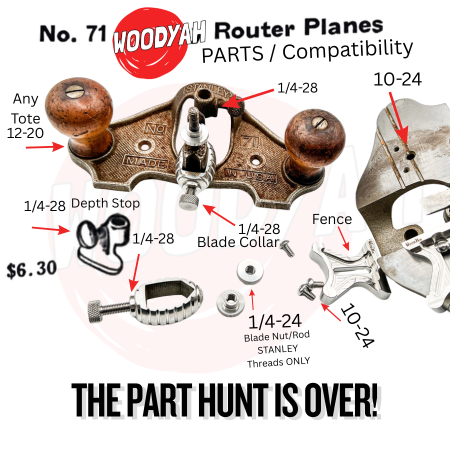 Router plane parts can be confusing across Stanley, Record, Millers Falls, and Sargent. Woodyah parts are designed for maximum compatibility whenever possible, and this section helps you quickly see what fits, what threads match, and where model differences matter.